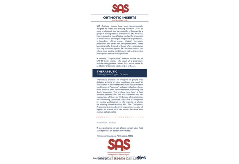 תוספות אורתוטיות של Sas תוכננו ביומכנית כדי לעמוד בסטנדרטים המחמירים המשמשים ספקים מקצועיים רבים לטיפול ברגל. משטחים אורתוטיים של Sas יכולים להקל על מצבים קיימים רבים, כמו גם למנוע התפתחות של בעיות בריאותיות בכף הרגל.